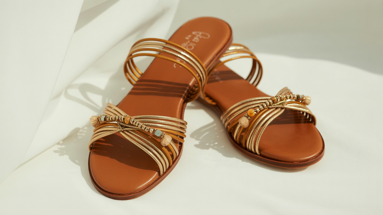 Embrace bohemian elegance with our brown and gold flat sandals, exquisitely detailed with metallic straps and charming beads. These comfortable artisan slides are perfect for adding a touch of unique style to your casual summer outfits.