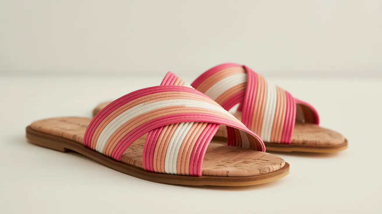 Embrace bohemian charm with our pink and white multi-strap criss-cross flat sandals. Designed with a comfortable cork-textured sole, these stylish slides are perfect for adding a touch of summery elegance to any outfit.