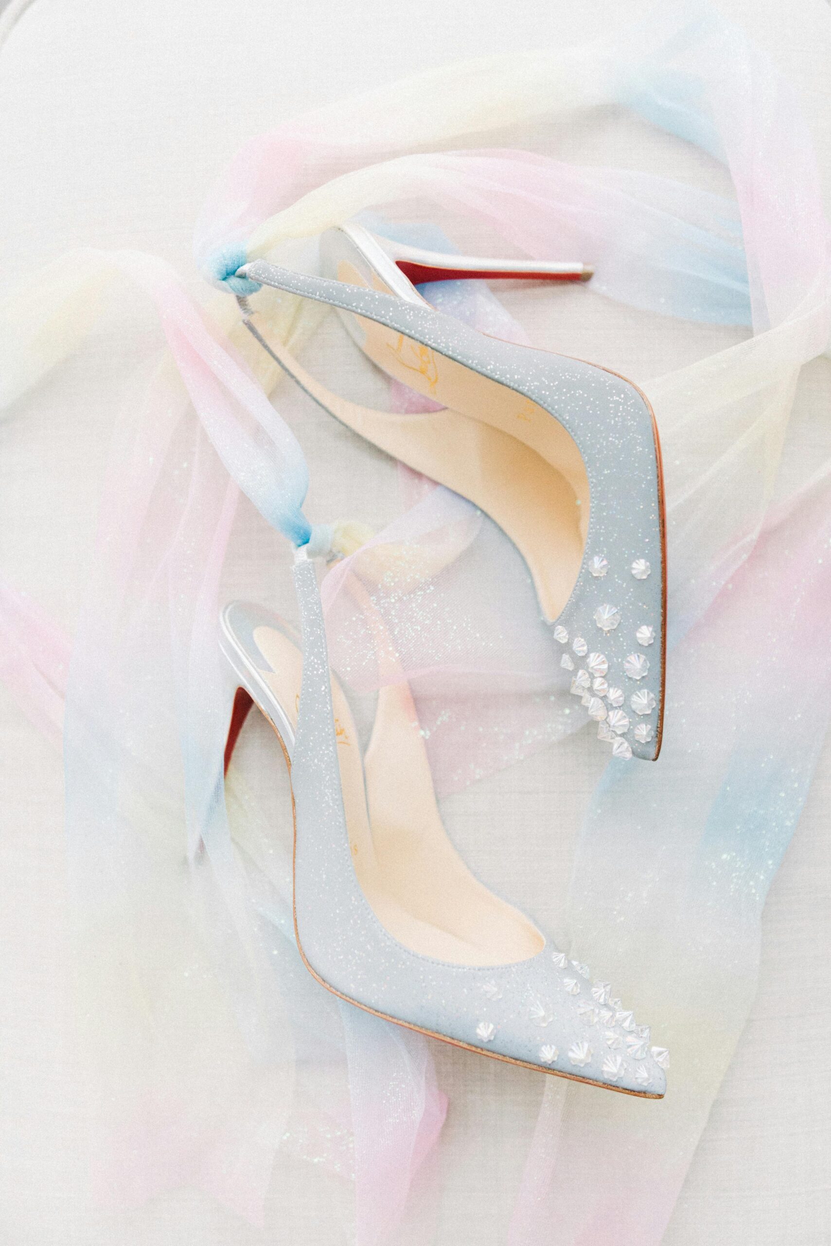 These sparkling blue slingback heels are designed to dazzle. Covered in glitter and adorned with clear studs on the toe, they feature a delicate heel and a playful pastel rainbow tulle backdrop, perfect for adding a touch of fairy-tale glamour to any special event.