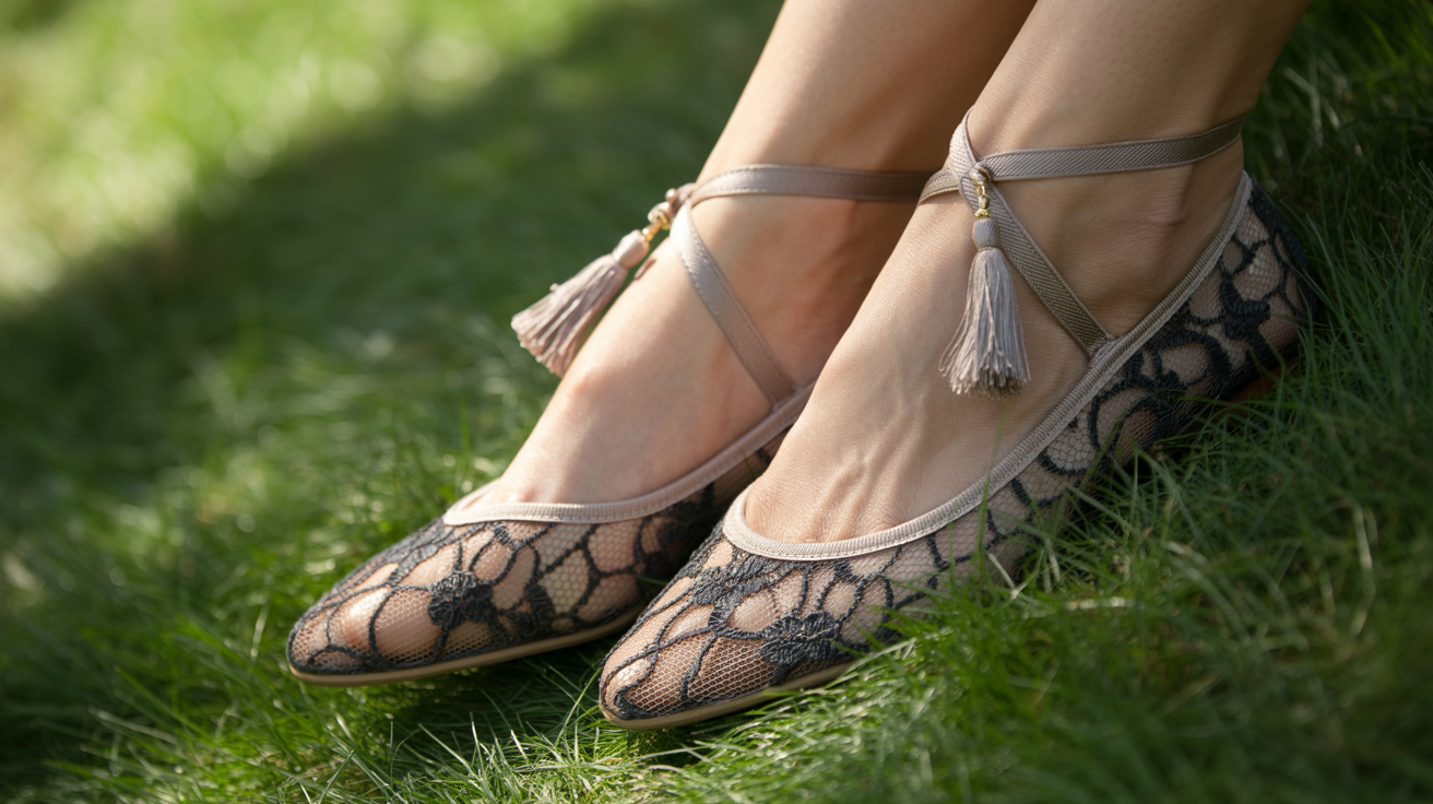 A detailed close-up of white lace flats, capturing the light and delicate design with an elegant touch. The tasseled ankle straps add a refined charm, making this footwear ideal for a stylish outing.