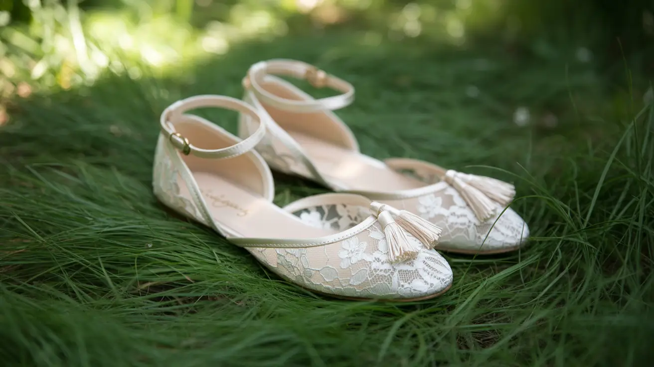 An elegant pair of ivory lace flats displayed with a gentle close-up, featuring intricate lacework and soft tassel details. The neutral tone and graceful design make these shoes perfect for any occasion.